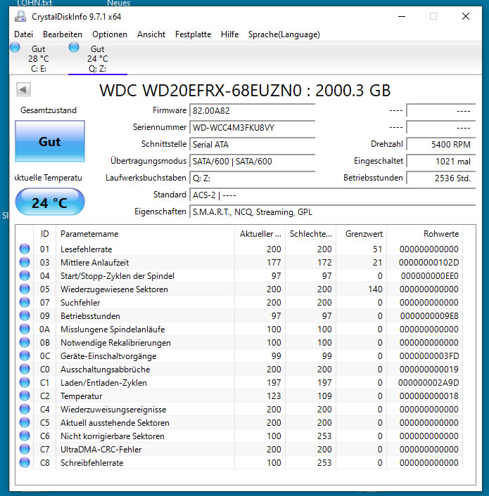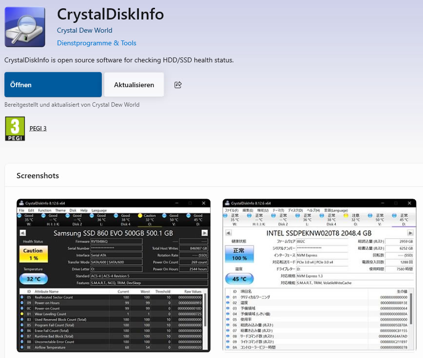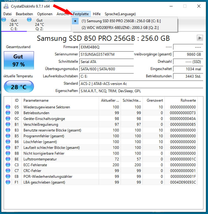 eine "Selbstdiagnose" eingebaut. Diese nennt sich "S.M.A.R.T" und die Werte können von externen Programmen wie z.B. CrystalDiskInfo